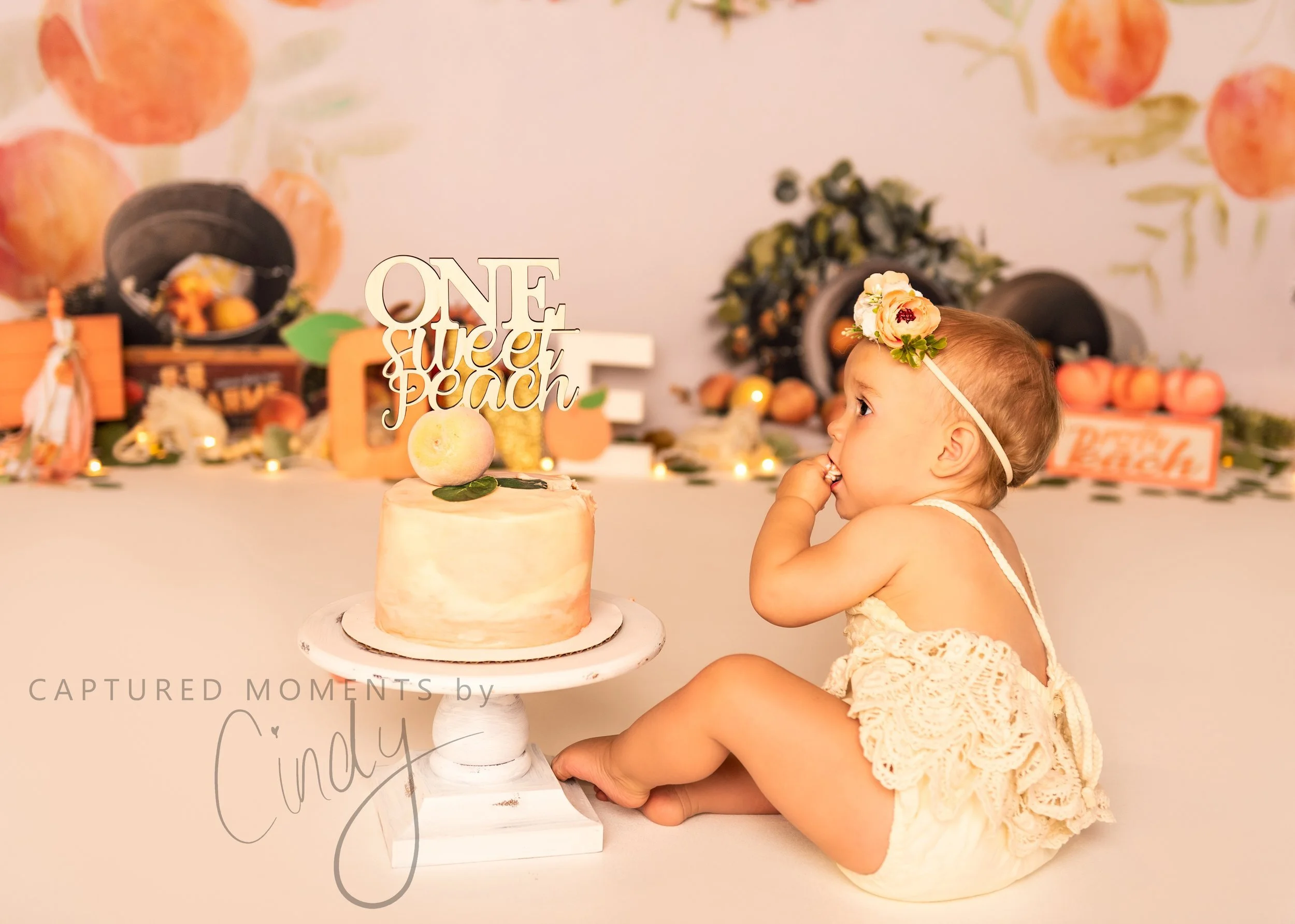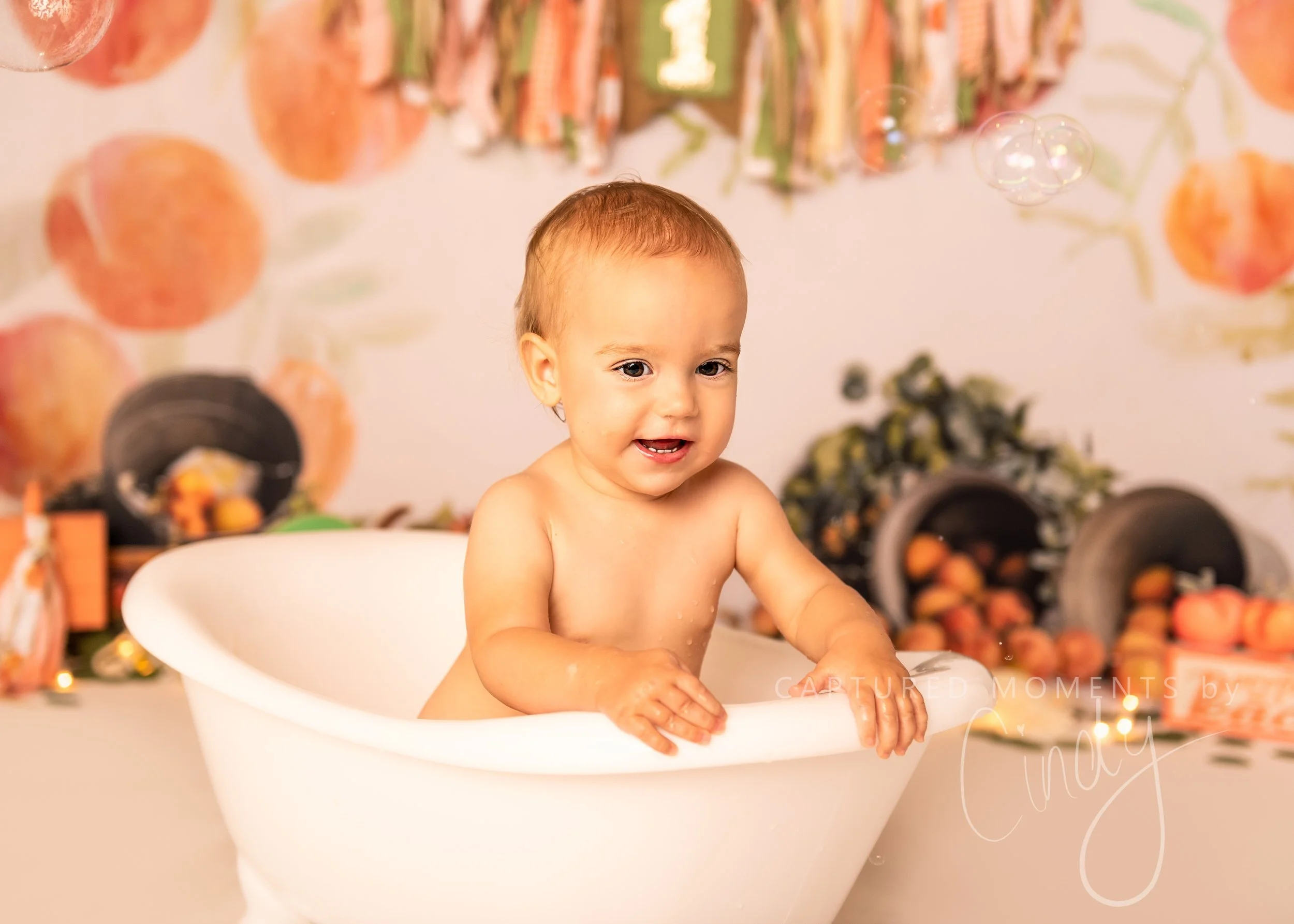 I love to start with high chair photographs. This allows me to focus on details like hands, feet, eyelashes, and other detail shots. We then move to the set and get a few of baby before the smashing takes place. I grab a photo of the cake before decimation (LOL!!) and then we allow baby to destroy that beautiful bakery masterpiece! And then, finally, we finish the session with an adorable fruit bath complete with bubbles. No reason for you to take home a sticky baby!